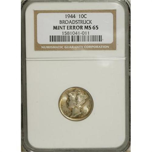 <B>1944 10C Mercury Dime--Broadstruck--MS65 NGC.</B></I> <BR><BR><B>Coin Engraver:</B> Adolph A. Weinman<BR><BR><b>Shipping:</b> Coins & Currency (<a target="_blank" href="http://www.heritageauctions.com/common/shipping.php">view shipping information</a>)