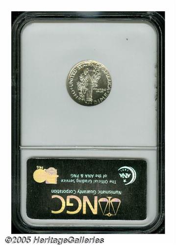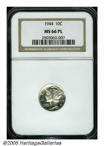 <B>1944<10C> MS66 Prooflike NGC.</B></I> Both the obverse and the reverse have unusual mirrored fields. Brilliant and splendidly preserved. This late issue is available in high Mint State grades, but Prooflikes are rare. In fact, this is the only 1944 Dime designated as Prooflike (as of 4/05) by NGC.