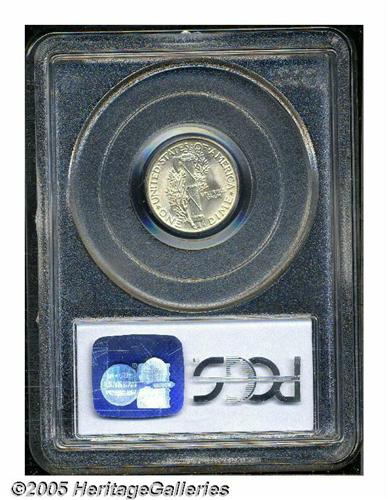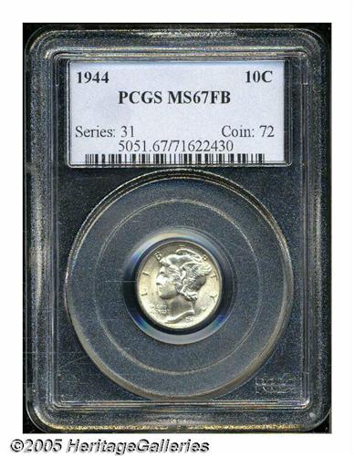 <B>1944<10C> MS67 Full Bands PCGS.</B></I> The 1944 is the most difficult issue from the 1940s to locate with Full Bands, after the 1945. Lange asserts that only 27% of this issue's extant Mint State population qualifies for this important designation. Pale silver-gold toning covers both sides. Fully struck and abrasion-free, both sides are impeccably produced with fully split and rounded crossbands. Neither NGC nor PCGS have certified a single coin above the present grade level. Population: 63 in 67 Full Bands, 0 finer (6/05).