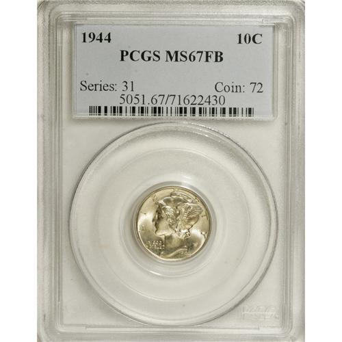 <B>1944 10C MS67 Full Bands PCGS.</B></I> The 1944 is the most difficult issue from the 1940s to locate with Full Bands, after the 1945. Pale silver-gold toning covers both sides. Fully struck and abrasion-free, both sides are impeccably produced with fully split and rounded cross bands. Neither NGC nor PCGS has certified a single coin above the present grade level.<BR><BR><b>Shipping:</b> Coins & Currency (<a target="_blank" href="http://www.heritageauctions.com/common/shipping.php">view shipping information</a>)