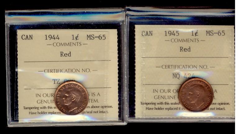 1944 & 1945 1¢ ICCS MS65RD. Lot of 2 coins both Gems.