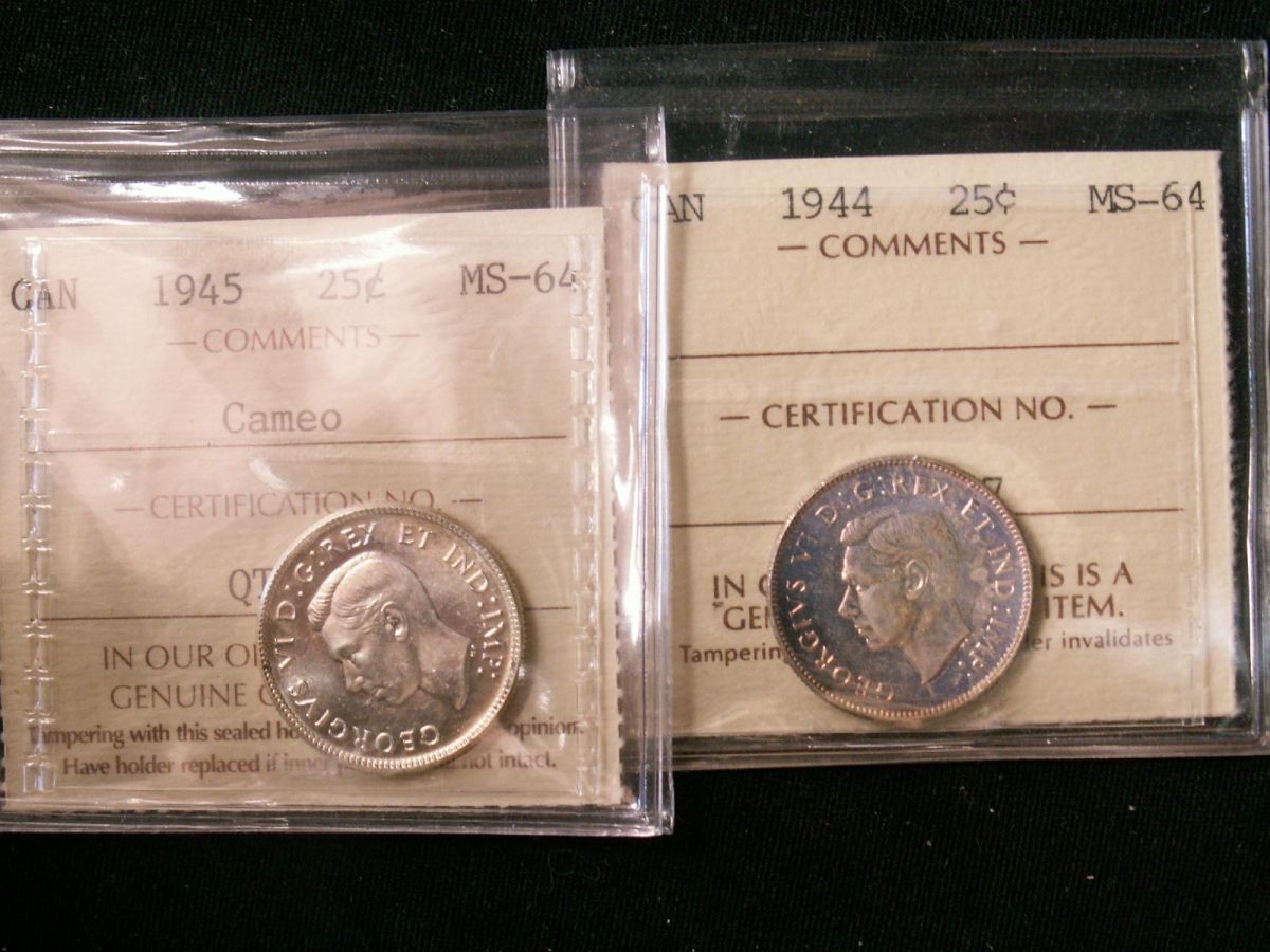 1944 & 1945 25¢ ICCS MS64. Lot of 2 coins with the 1945 designated as Cameo.