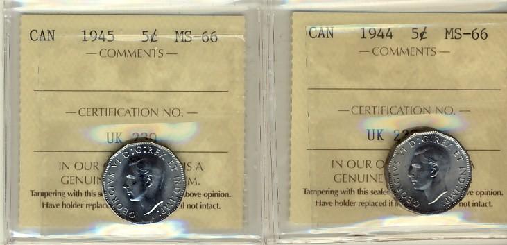 1944 & 1945 5¢ ICCS MS66. Gem pair of coins.