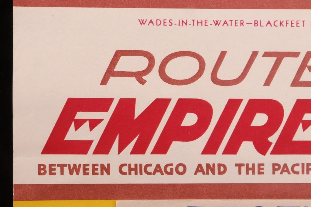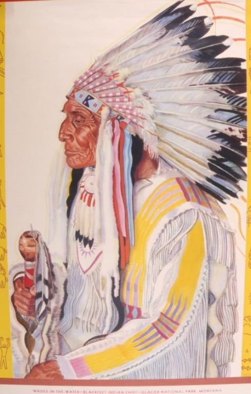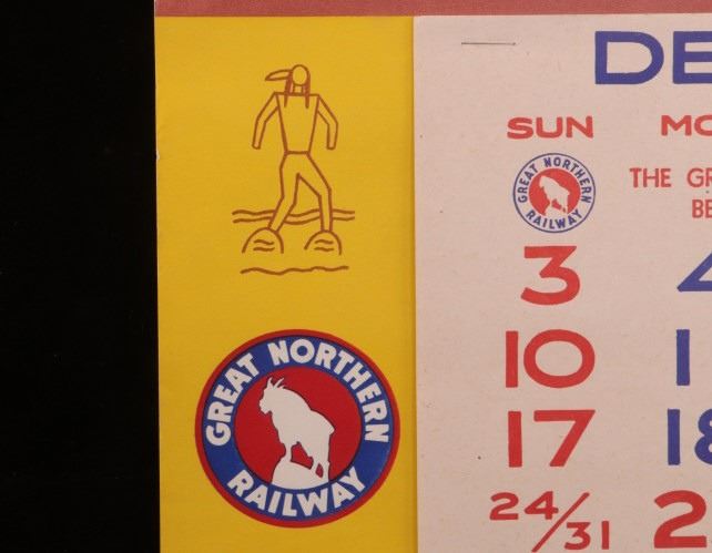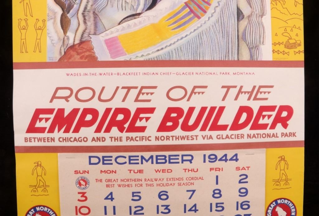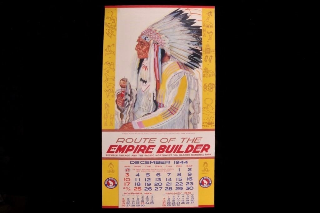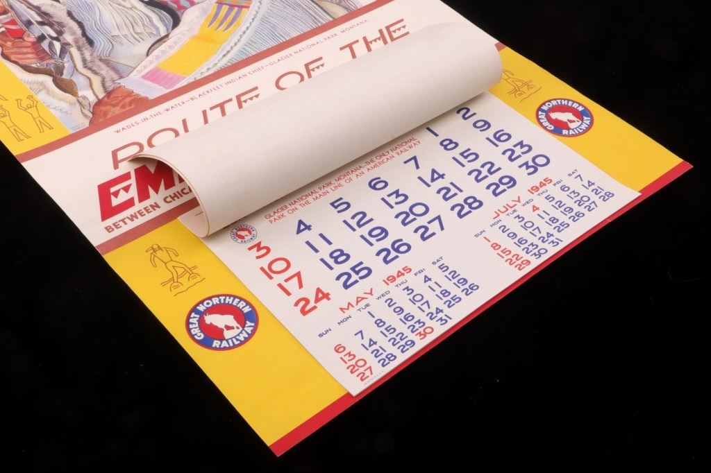 Featured in this lot is this original 1945 calendar from the Great Northern Railway. The calendar features the artwork of Winold Reiss, who is well known for his artwork of the Blackfeet Indians. This piece shows Blackfeet Indian Chief "Wades-In-The-Water". The calendar shows good condition and appears to be complete with 13 months from December 1944 - 1945. The calendar measures 32 3/4" x 16".
