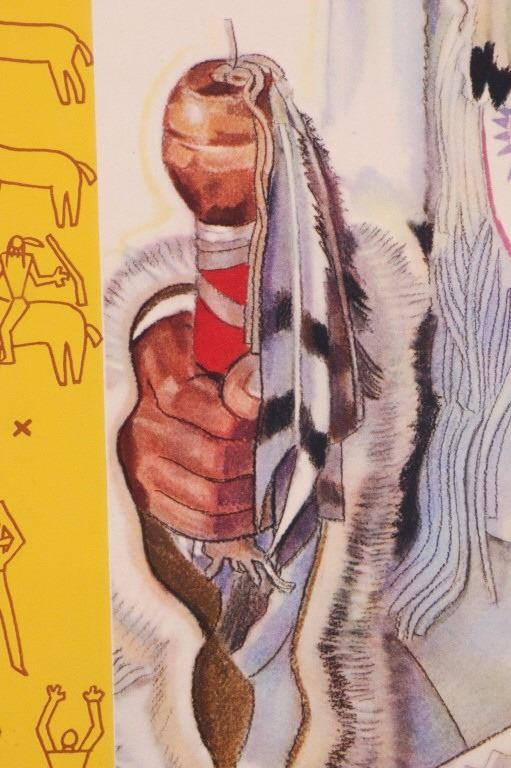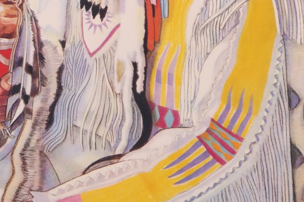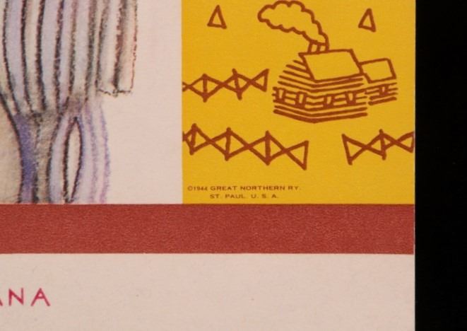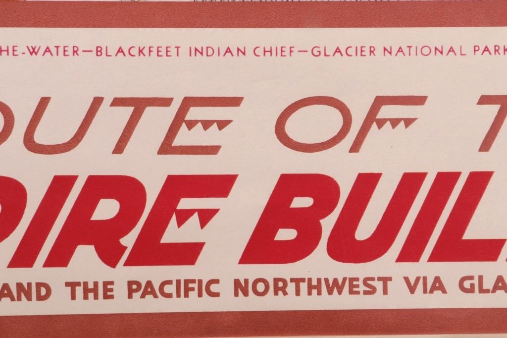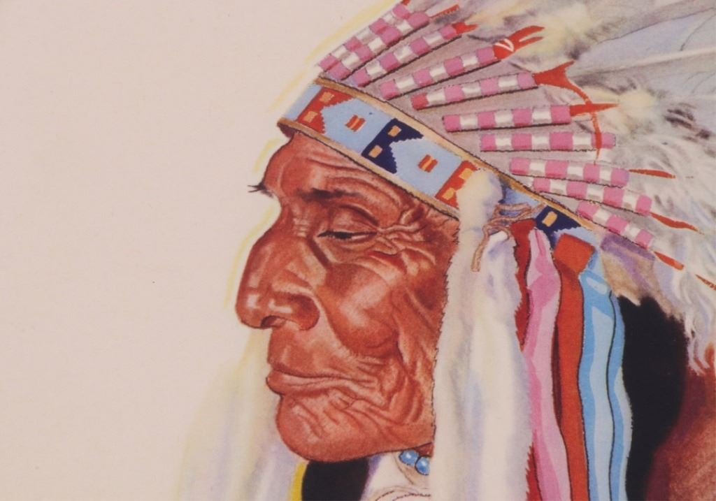 Featured in this lot is this original 1945 calendar from the Great Northern Railway. The calendar features the artwork of Winold Reiss, who is well known for his artwork of the Blackfeet Indians. This piece shows Blackfeet Indian Chief "Wades-In-The-Water". The calendar shows good condition and appears to be complete with 13 months from December 1944 - 1945. The calendar measures 32 3/4" x 16".