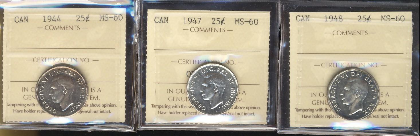 1944, 1947, 1948 25¢ all ICCS MS60, Lot of 3 coins,