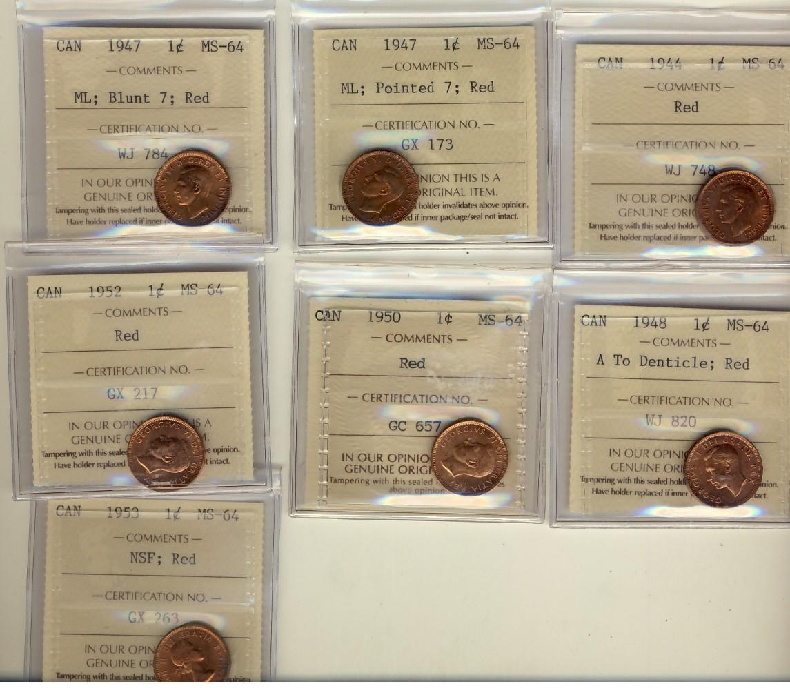 1944, 1947 ML Blt 7, ML Ptd 7, 1948 A To, 1950, 1952 & 1953 NSF 1¢ ICCS MS64RD. Lot of 7 Coins.