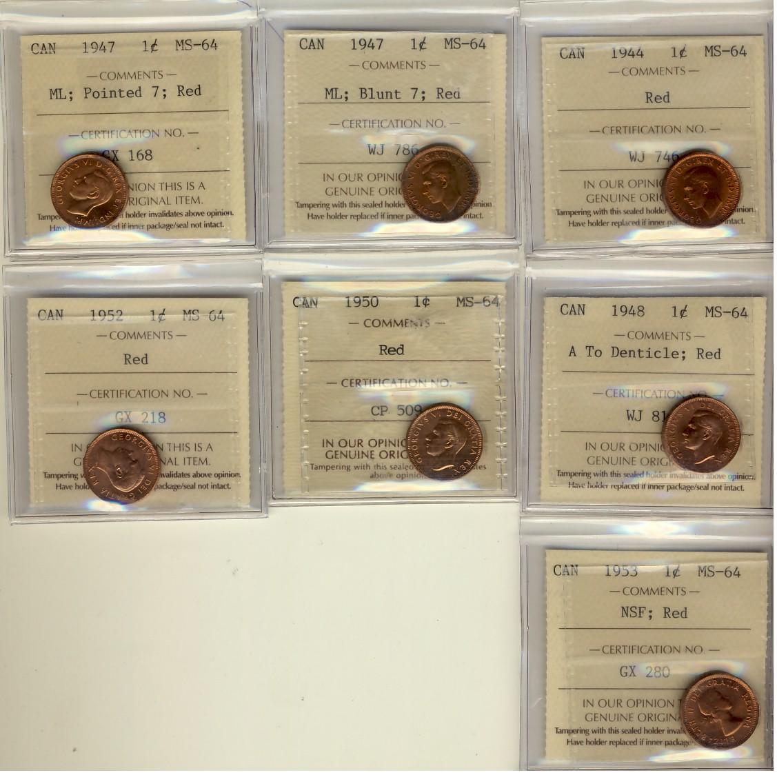 1944, 1947 ML Blt 7, ML Ptd 7, 1948 A To, 1950, 1952 & 1953 NSF 1¢ ICCS MS64RD. Lot of 7 Coins.