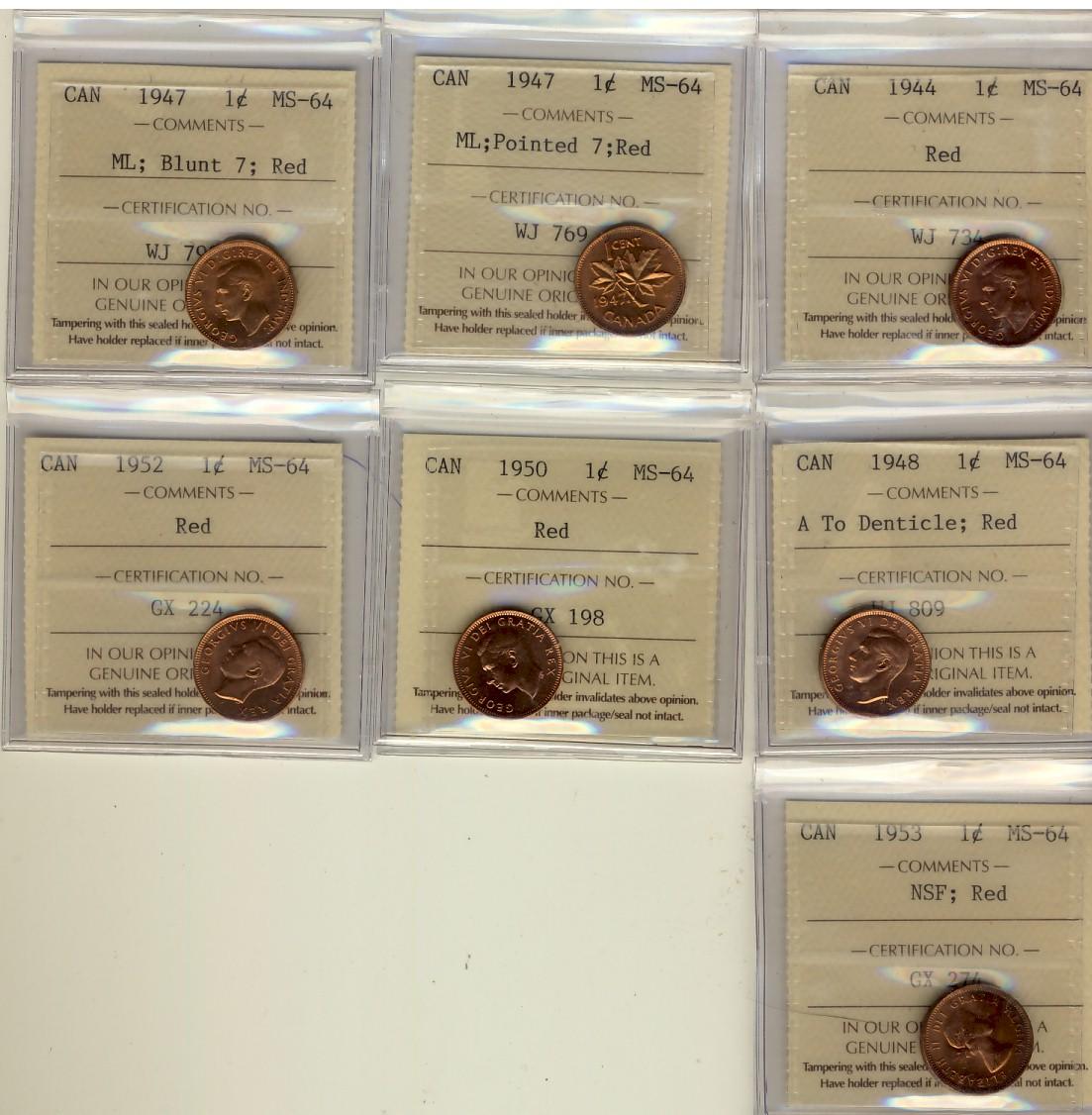 1944, 1947 ML Blt 7, ML Ptd 7, 1948 A To, 1950, 1952 & 1953 NSF 1¢ ICCS MS64RD. Lot of 7 Coins.