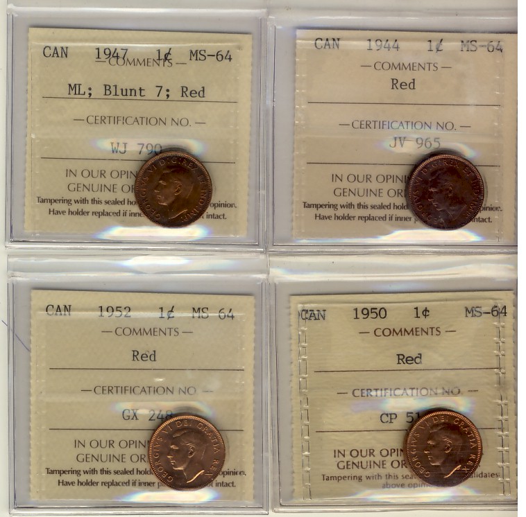 1944, 1947 ML Blt7, 1950 & 1952 1¢ ICCS MS64RD. Lot of 4 coins.