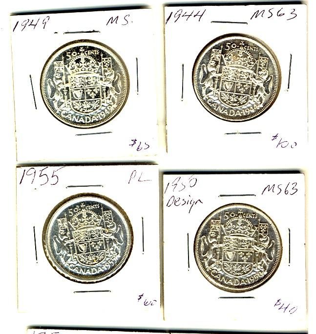 1944, 1949, 1950 Des & 1955 50¢. Lot of 4 coins MS60+++.
