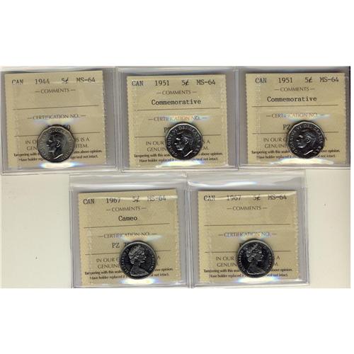 1944, 1951 & 1967 5¢ ICCS MS64. Lot of 5 coins all MS6