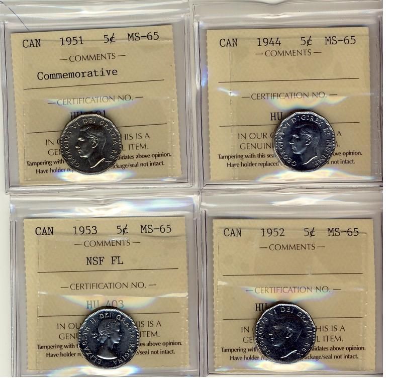 1944, 1951 Comm, 1952 & 1953 NSF FL 5¢ ICCS MS65. Lot of 4 coins.