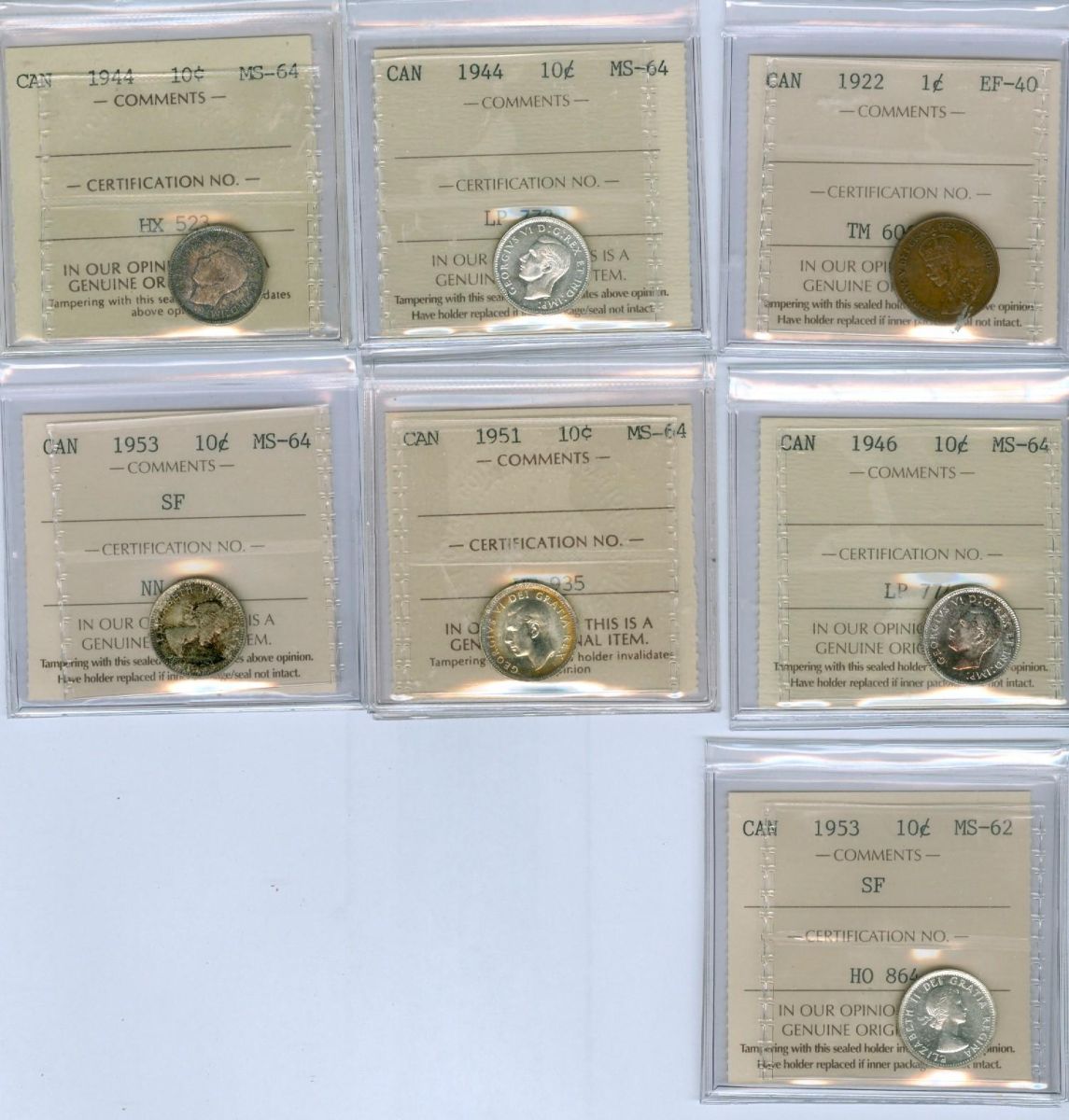 1944-1953 SF 10¢. Lot of six 10¢ all ICCS MS64 and a 1922 1¢ ICCS EF40. Lot includes 10¢, 1944 (2), 1946, 1951, 1953 and 1953 SF MS62.