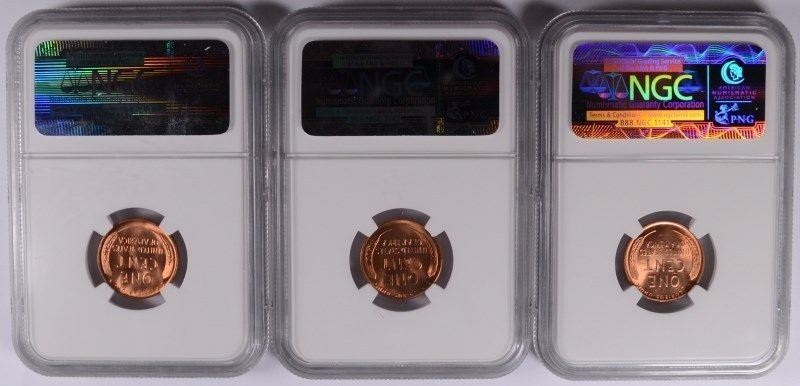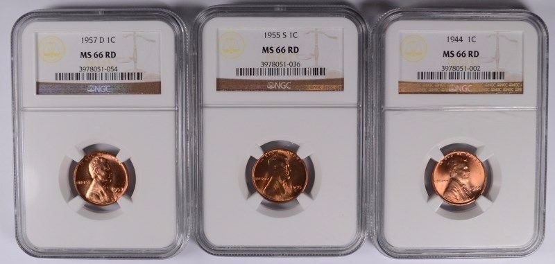 1944, 1955-S, 1957-D LINCOLN CENTS NGC MS-66 RED