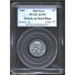 1944 1C Cent--Struck on a Steel Planchet--AU55 PCGS. While not as popular (or as expensive) as the 1943 Copper Cents, the 1944 Steel Cents have a similar charm. They are not as popular as 1943 Copper Cents because they were not publicized and hyped by the popular press during the 1950s and 1960s. Yet, the 1944 Steel Cents are just as scarce. This piece shows evidence of light oxidation and there is just a trace of friction that accounts for the AU55 grade. Sharply struck on the obverse with good remaining luster.  Important notice: We expect to be auctioning lots at the rate of 200-250 per hour. Sometimes eBay Premier live bid software cannot keep up with that pace, so we strongly recommend that you place a realistic proxy bid now as insurance to avoid disappointment. Also please note that all Heritage/CAA lots purchased through eBay Premier carry a 20% Buyer's Premium.