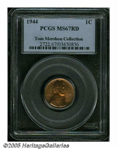 <B>1944<1C> MS67 Red PCGS.</B></I> Fully struck with bright luster and lovely apricot-tan and pastel rose toning. One small contact mark resides directly behind Lincoln's head. None have been ranked any finer, by PCGS (3/05).<BR><I>From The Tom Mershon #2 All-Time PCGS Registry Set of Lincoln Wheat Cents.</B></I>
