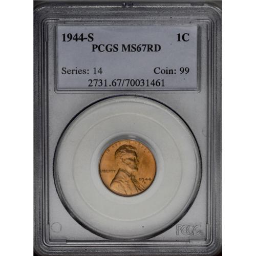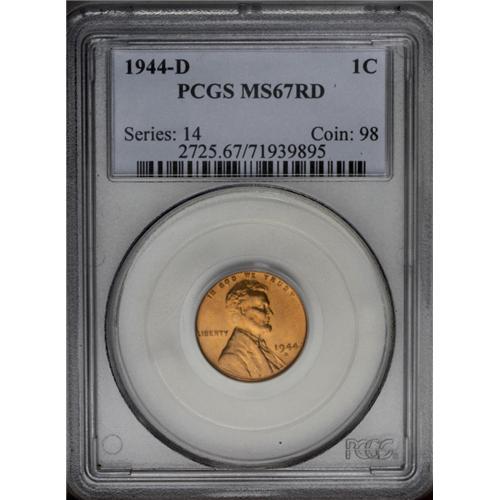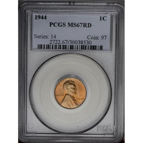 1944 1C MS67 Red PCGS, peach-red fields surround tan-g