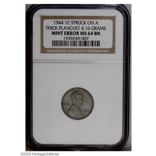 1944 1C Mint Error MS64 Brown NGC. Struck on a Thick P 1944[1C] Mint Error MS64 Brown NGC.