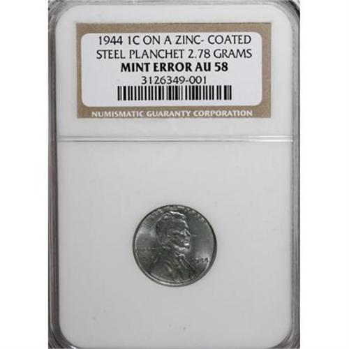 <B>1944 1C --Struck on a Steel Planchet--AU58 NGC.</B></I> 2.78 gm. While wrong-planchet errors are staples for the oddities enthusiast, few such pieces have achieved widespread currency among regular-series collectors. The 1944 steel cents, struck a year after the Mint's one-off production of coins in that metal, have gained general acceptance, and many high-end collectors will procure an example as a fascinating complement to a set of Lincoln cents.<BR> This steel-gray example shows occasional dots of sage in the fields. The strike is a touch soft, as usual for coins made of steel, but the devices show only a trace of friction. A fascinating representative that should find an appreciative home with a discerning enthusiast.<BR><BR><B>Coin Engraver:</B> Victor D. Brenner<BR><BR><b>Shipping:</b> Coins & Currency (<a target="_blank" href="http://www.heritageauctions.com/common/shipping.php">view shipping information</a>)