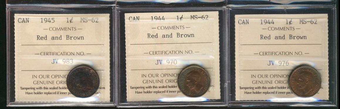 1944(2) & 1945 1¢ ICCS MS62RB. Lot of 3 coins.