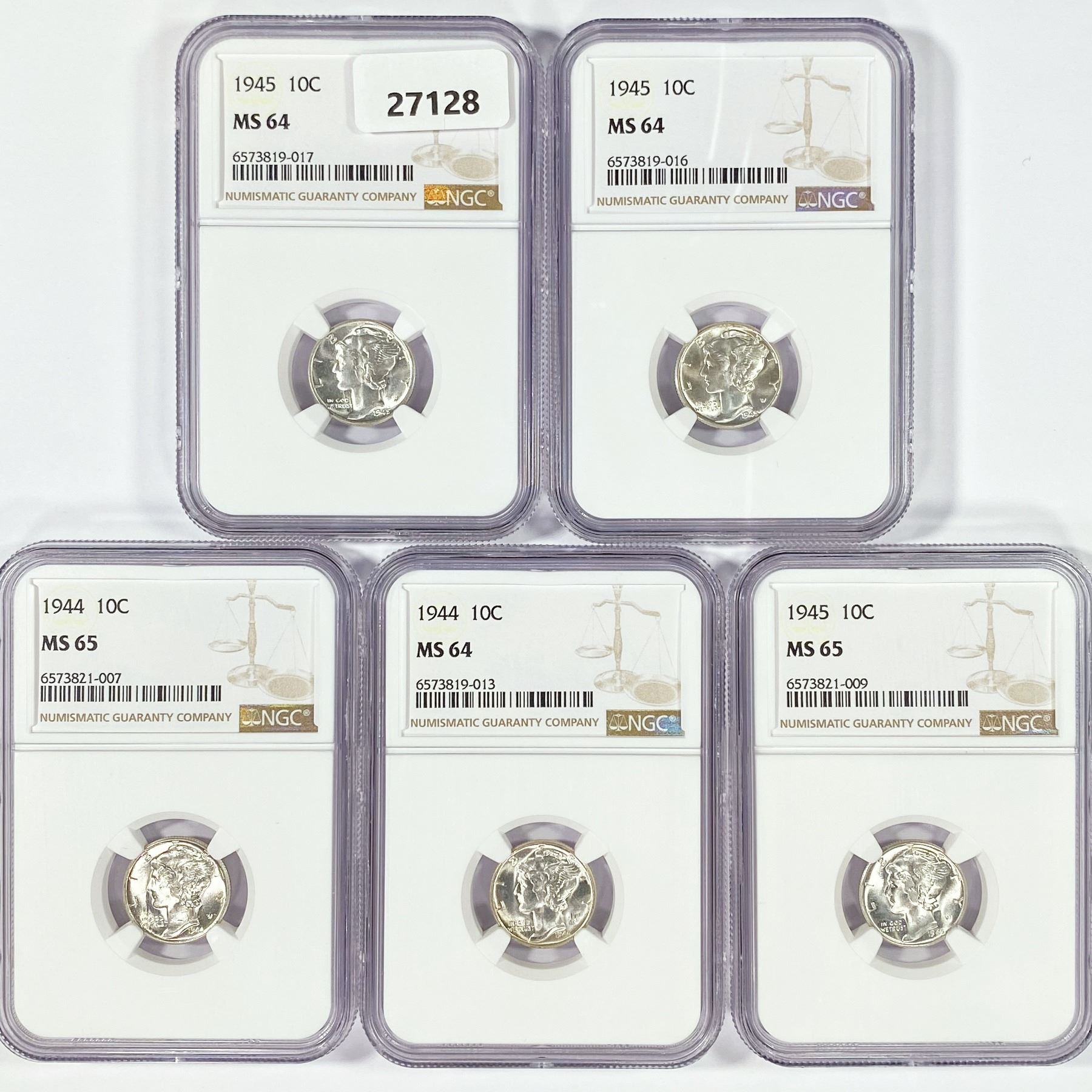 1944 (2), 1945(3) Set Mercury Silver Dime NGC MS