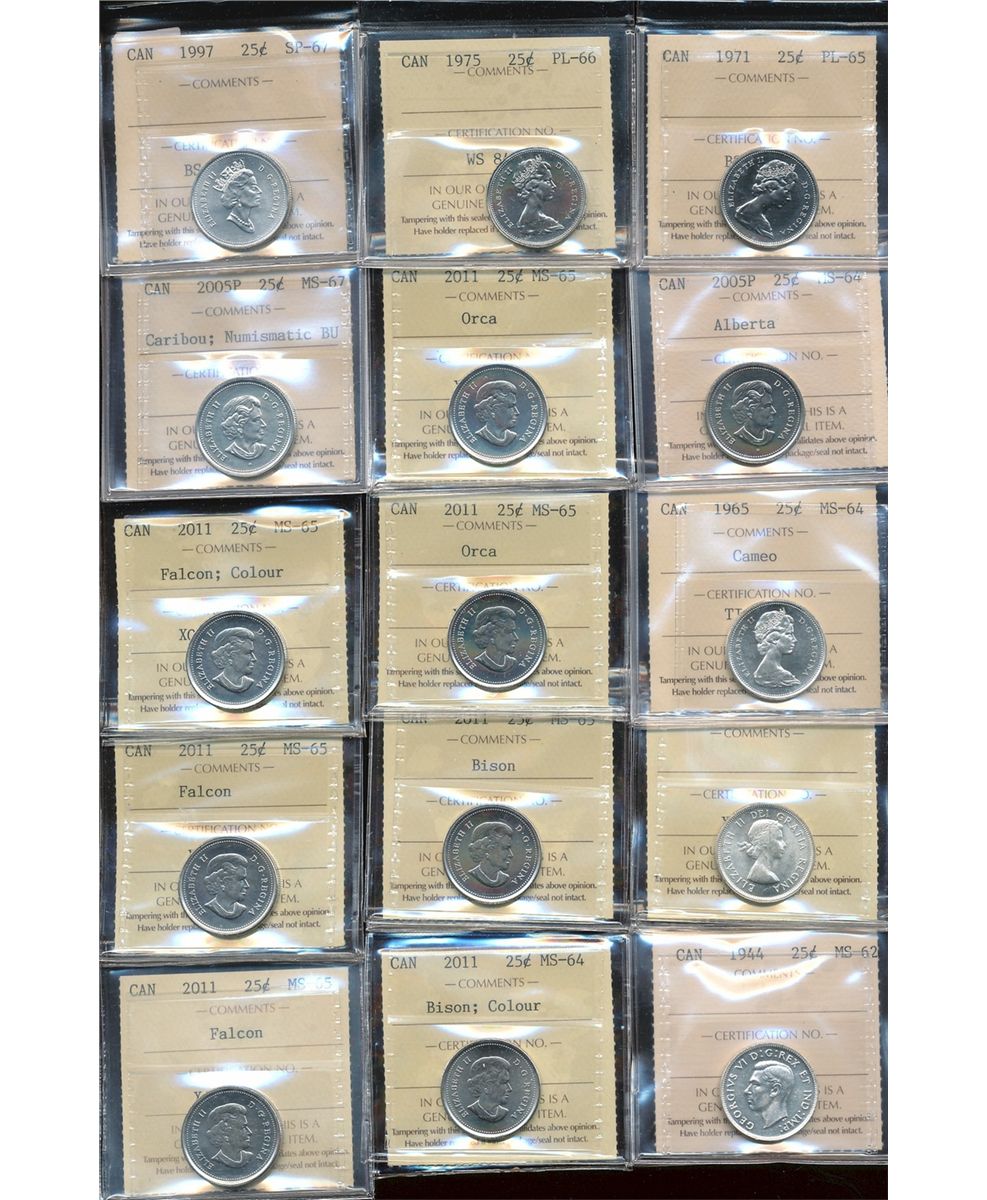 1944 25¢ MS62, 1962, 1965, 2005P Alb, 2011 Bison Colour all MS64, 2011 Bison, Orca(2), Falcon(2), Falcon colour all MS65,2005P Caribou NBU MS67, 1971 PL65, 1975 PL66 & 1997 SP67. Lot of 15 coins all ICCS graded.