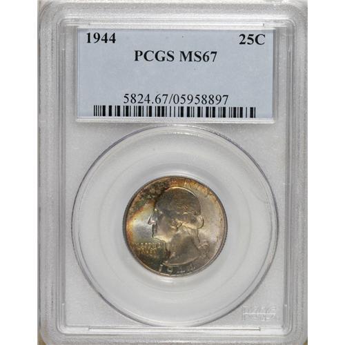 <B>1944 25C MS67 PCGS.</B></I> This Superb Washington quarter displays coruscating luster and vivid splashes of gold, crimson, forest-green, violet, and sky-blue toning. Exquisite striking definition further enhances the outstanding eye appeal, as do the impeccably preserved surfaces. Virtually unobtainable any finer. Population: 50 in 67, 0 finer (2/07).<BR><BR><b>Shipping:</b> Coins & Currency (<a target="_blank" href="http://www.heritageauctions.com/common/shipping.php">view shipping information</a>)