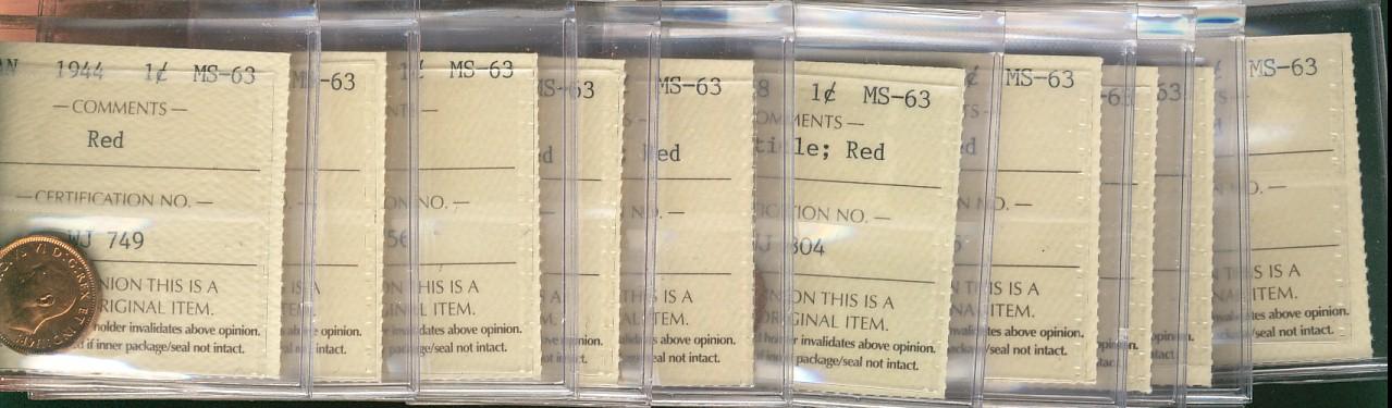 1944(3), 1948 A To(3) & 1954 SF(4) 1¢ ICCS MS63RD. Lot of 10 coins.