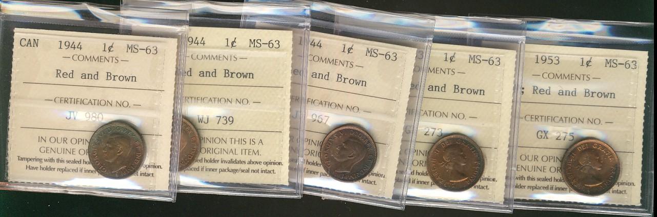 1944(3)& 1953 NSF 1¢ ICCS MS63RB. Lot of 5 coins.