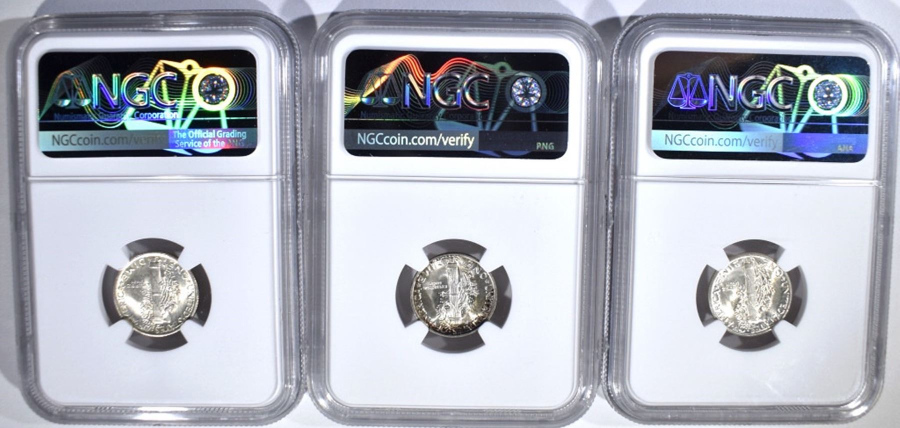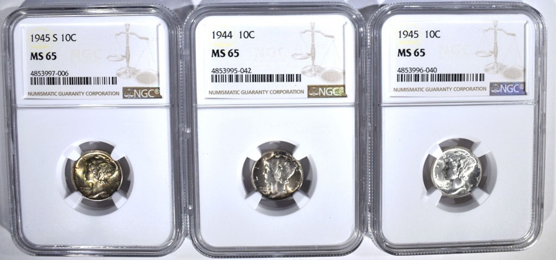 1944, 45 & 45-S MERCURY DIMES, NGC MS-65