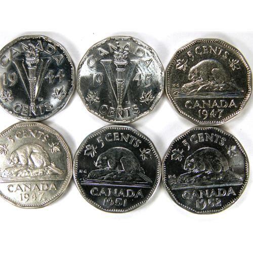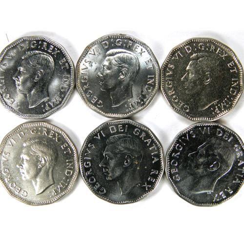 Canada Five Cents 1944, 1945, 1947, 1947 Maple Leaf, 1951 Low Relief and 1952. Total six pieces, all Choice Uncirculated to Gem Uncirculated