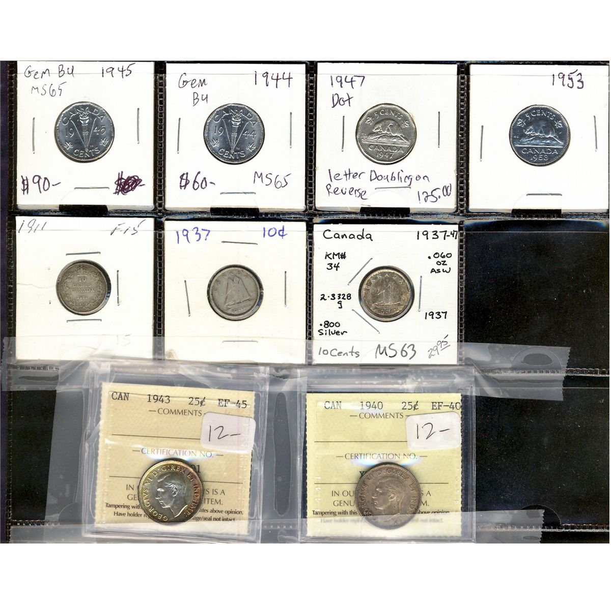 1944 5¢, 1945, 1947 Dot, 1953, 1911 10¢, 1937(2), 1940 25¢ & 1943. Lot of 9 pcs VG to UNC with both 25¢ ICCS graded .