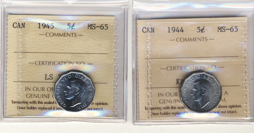 1944 5¢ & 1945 ICCS MS65. Lot of 2 coins.