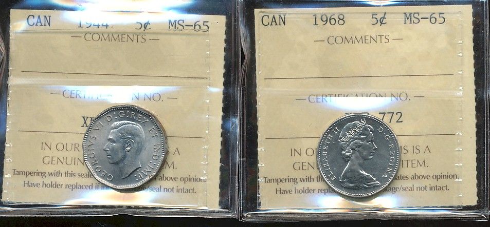 1944 5¢ & 1968 ICCS MS65. Lot of 2 coins.