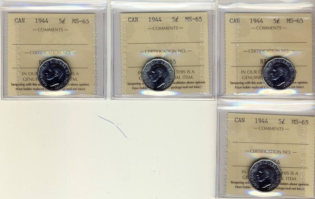 1944 5¢ ICCS MS65. Lot of 4 coins all brilliant and lustrous.