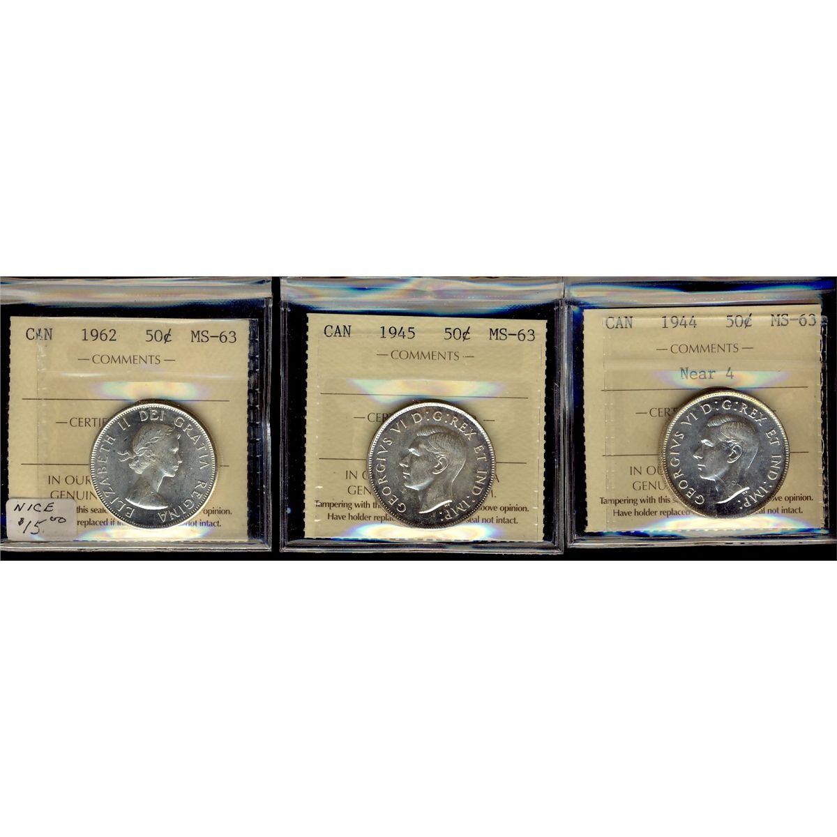 1944 50¢, 1945 & 1962 ICCS MS63. Lot of 2 coins.