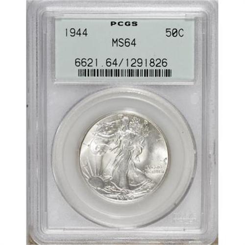 <B>1944 50C MS64 PCGS.</B></I> . PCGS Population (3661/4262). NGC Census: (2203/3302). Mintage: 28,206,000. Numismedia Wsl. Price for NGC/PCGS coin in MS64: $48. (#6621)<BR><BR><B>Coin Engraver:</B> Adolph A. Weinman<BR><BR><b>Shipping:</b> Coins & Currency (<a target="_blank" href="http://www.heritageauctions.com/common/shipping.php">view shipping information</a>)