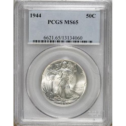 <B>1944 50C MS65 PCGS.</B></I> PCGS Population (3194/874). NGC Census: (2483/763). Mintage: 28,206,000. Numismedia Wsl. Price for NGC/PCGS coin in MS65: $152. (#6621)<BR><BR><b>Shipping:</b> Coins & Currency (<a target="_blank" href="http://www.heritageauctions.com/common/shipping.php">view shipping information</a>)