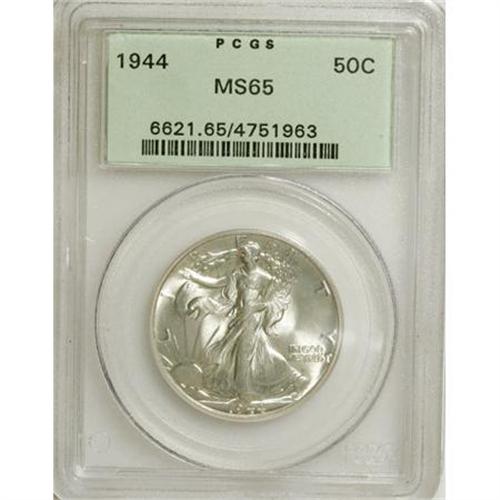 <B>1944 50C MS65 PCGS.</B></I> PCGS Population (3194/874). NGC Census: (2484/763). Mintage: 28,206,000. Numismedia Wsl. Price for NGC/PCGS coin in MS65: $152. (#6621)<BR><BR><b>Shipping:</b> Coins & Currency (<a target="_blank" href="http://www.heritageauctions.com/common/shipping.php">view shipping information</a>)