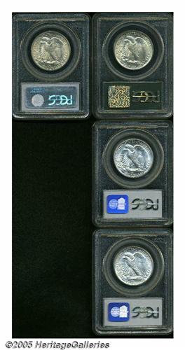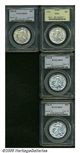 <B>1944<50C> MS65 PCGS,</B></I> rich apricot and sky-blue patina; <B>1944-D MS65 PCGS,</B></I> a crisp strike, a luster graze or two on the right obverse field; <B>1946-D MS65 PCGS,</B></I> a good strike, clean and satiny; and a <B>1947-D MS65 PCGS,</B></I> medium gold color, a decent strike, a splendid obverse.