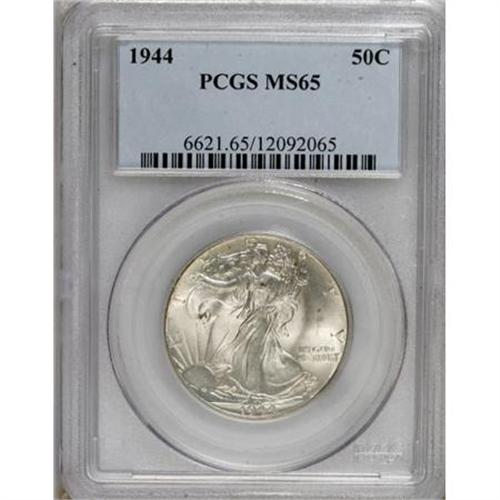<B>1944 50C MS65 PCGS.</B></I> PCGS Population (3282/911). NGC Census: (2505/770). Mintage: 28,206,000. Numismedia Wsl. Price for NGC/PCGS coin in MS65: $175. (#6621)<BR><BR><B>Coin Engraver:</B> Adolph A. Weinman<BR><BR><b>Shipping:</b> Coins & Currency (<a target="_blank" href="http://www.heritageauctions.com/common/shipping.php">view shipping information</a>)