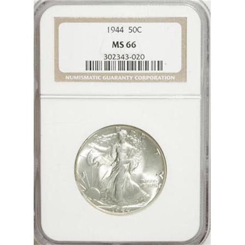 <B>1944 50C MS66 NGC.</B></I> NGC Census: (702/68). PCGS Population (857/59). Mintage: 28,206,000. Numismedia Wsl. Price for NGC/PCGS coin in MS66: $240. (#6621)<BR><BR><B>Coin Engraver:</B> Adolph A. Weinman<BR><BR><b>Shipping:</b> Coins & Currency (<a target="_blank" href="http://www.heritageauctions.com/common/shipping.php">view shipping information</a>)