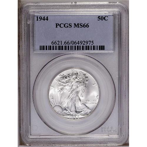 <B>1944<50C> MS66 PCGS.</B></I> A typical Premium Gem, with booming luster and knockout appeal. Completely white, and desirable as such. <BR><BR><B>Important notice:</B> Heritage usually auctions material at the rate of 200-250 lots per hour. On some occasions eBay Live bid software or the Internet may not be able to keep up with the pace of the auction. We recommend placing a realistic absentee bid now as insurance to avoid disappointment. Occasionally the auctioneer may eliminate or reject an eBay Live bid, and the auctioneer may also reopen a lot after the close of the eBay live bidding (usually because we missed an audience bid), and may reject your bid even if it shows you as the winning bidder. By bidding via eBay Live, you agree that Heritage may award the lot to another bidder at its sole discretion under the circumstances described above or any other reasonable circumstances. Since eBay bids are not shown to us until we open the lot on the floor, we treat those bids just like floor bids. In most cases the floor responds before the eBay bid is presented to us, due to Internet lag time, so for consistency we have made it a policy that floor bids are always considered first over tie eBay live bids. Also please note that all Heritage lots purchased through eBay Live carry a 20% Buyer's Premium. Please make sure you read the Terms and Conditions before you bid. This lot is being auctioned in conjunction with a live floor auction by Heritage Galleries & Auctioneers. All final auction and invoice information will be supplied by Heritage Galleries & Auctioneers, and all other information should be considered preliminary. Lot:3009 <BR><BR><B>Winning Notification and Billing:</B> After the FINAL session in this auction is complete, Heritage will send e-mail and snail mail invoices. This process normally takes several days. All final auction and invoice information will be supplied by Heritage Galleries & Auctioneers, and all other information should be considered preliminary. <BR><BR>This auction will be conducted on a live auction floor and over the Internet through eBay Live. If you choose to place an absentee bid, please take a moment to <font color='#0000ff'><u><a href='http://pages.ebay.com/liveauctions/help/before/laabsentee.html'>learn how eBay Live absentee bidding works</a></u></font><font color='#000000'>