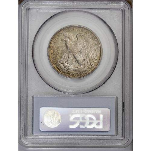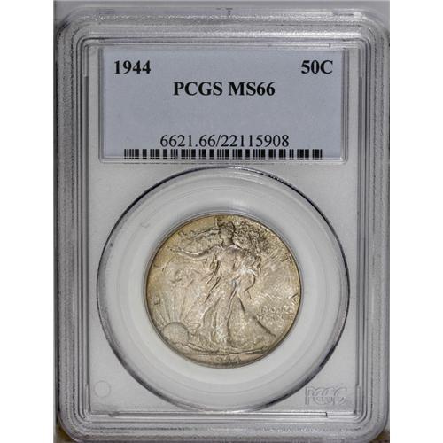 <B>1944<50C> MS66 PCGS.</B></I> Cartwheel luster blasts through rich layers of apple-green and apricot toning. This nicely struck Premium Gem has only one detectable mark, found on a wing border above the shoulder. <BR><BR><B>Important notice:</B> Heritage usually auctions material at the rate of 200-250 lots per hour. On some occasions eBay Live bid software or the Internet may not be able to keep up with the pace of the auction. We recommend placing a realistic absentee bid now as insurance to avoid disappointment. Occasionally the auctioneer may eliminate or reject an eBay Live bid, and the auctioneer may also reopen a lot after the close of the eBay live bidding (usually because we missed an audience bid), and may reject your bid even if it shows you as the winning bidder. By bidding via eBay Live, you agree that Heritage may award the lot to another bidder at its sole discretion under the circumstances described above or any other reasonable circumstances. Since eBay bids are not shown to us until we open the lot on the floor, we treat those bids just like floor bids. In most cases the floor responds before the eBay bid is presented to us, due to Internet lag time, so for consistency we have made it a policy that floor bids are always considered first over tie eBay live bids. Also please note that all Heritage lots purchased through eBay Live carry a 20% Buyer's Premium. Please make sure you read the Terms and Conditions before you bid. This lot is being auctioned in conjunction with a live floor auction by Heritage Galleries & Auctioneers. All final auction and invoice information will be supplied by Heritage Galleries & Auctioneers, and all other information should be considered preliminary. Lot:3010 <BR><BR><B>Winning Notification and Billing:</B> After the FINAL session in this auction is complete, Heritage will send e-mail and snail mail invoices. This process normally takes several days. All final auction and invoice information will be supplied by Heritage Galleries & Auctioneers, and all other information should be considered preliminary. <BR><BR>This auction will be conducted on a live auction floor and over the Internet through eBay Live. If you choose to place an absentee bid, please take a moment to <font color='#0000ff'><u><a href='http://pages.ebay.com/liveauctions/help/before/laabsentee.html'>learn how eBay Live absentee bidding works</a></u></font><font color='#000000'>