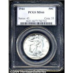 <B>1944<50C> MS66 PCGS.</B></I> Well struck, and nearly untoned and brilliant, save for light russet mottling on the reverse. Adequately struck with virtually blemish-free surfaces. <BR><BR><B>Important notice:</B> Heritage usually auctions material at the rate of 200-250 lots per hour. On some occasions eBay Live bid software or the Internet may not be able to keep up with the pace of the auction. We recommend placing a realistic absentee bid now as insurance to avoid disappointment. Occasionally the auctioneer may eliminate or reject an eBay Live bid, and the auctioneer may also reopen a lot after the close of the eBay live bidding (usually because we missed an audience bid), and may reject your bid even if it shows you as the winning bidder. By bidding via eBay Live, you agree that Heritage may award the lot to another bidder at its sole discretion under the circumstances described above or any other reasonable circumstances. Since eBay bids are not shown to us until we open the lot on the floor, we treat those bids just like floor bids. In most cases the floor responds before the eBay bid is presented to us, due to Internet lag time, so for consistency we have made it a policy that floor bids are always considered first over tie eBay live bids. Also please note that all Heritage lots purchased through eBay Live carry a 20% Buyer's Premium. Please make sure you read the Terms and Conditions before you bid.