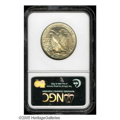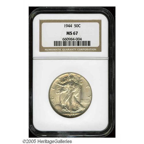 <B>1944<50C> MS67 NGC.</B></I> An simply stunning survivor of this 1940s delivery, the boldly impressed features glow with frosty luster and light silver-golden toning that deepens on the lower half of the reverse. There is not a single distracting blemish. A date that is easily obtainable in lower grades, Superb Gems are remarkably elusive for a high mintage issue from this decade. Census: 60 in 67, 0 finer (10/05).