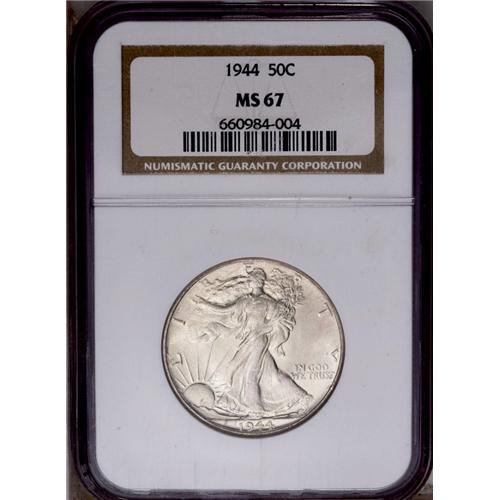 <B>1944<50C> MS67 NGC.</B></I> A simply stunning survivor of this 1940s delivery. The boldly impressed features glow with frosty luster and light silver-golden toning that deepens on the lower half of the reverse. There are no distracting blemishes. This issue is easily obtainable in lower grades, but Superb Gems are remarkably elusive for a high mintage issue from this decade. Census: 61 in 67, 0 finer (4/06).