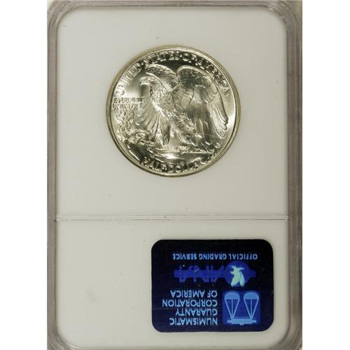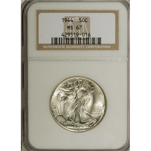 <B>1944 50C MS67 NGC.</B></I> Highly lustrous with above-average detail evident on the branch hand. Each side is essentially untoned. This MS67 specimen is among the finest at both NGC and PCGS (2/07).<BR><BR><b>Shipping:</b> Coins & Currency (<a target="_blank" href="http://www.heritageauctions.com/common/shipping.php">view shipping information</a>)