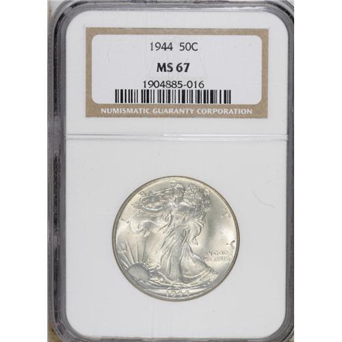 <B>1944 50C MS67 NGC.</B></I> Vibrant luster and a whisper of olive patina affirm the originality of this well preserved and nicely struck Superb Gem. Census: 65 in 67, 0 finer (3/07).<BR><BR><b>Shipping:</b> Coins & Currency (<a target="_blank" href="http://www.heritageauctions.com/common/shipping.php">view shipping information</a>)